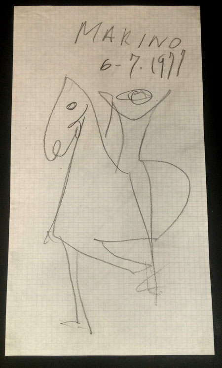 Descripción: "Cavallo e Cavaliere" Dibujo a lápiz realizado en Milán en 1977, certificado por el comité cientÃfico compuesto por D. Afredo Coen,D.Flavio Fergonzi y Doctora Maria Teresa Tossi de la Fundazione Marino Marini,inscrito en los archivos de la Fundación con el número 725 |
